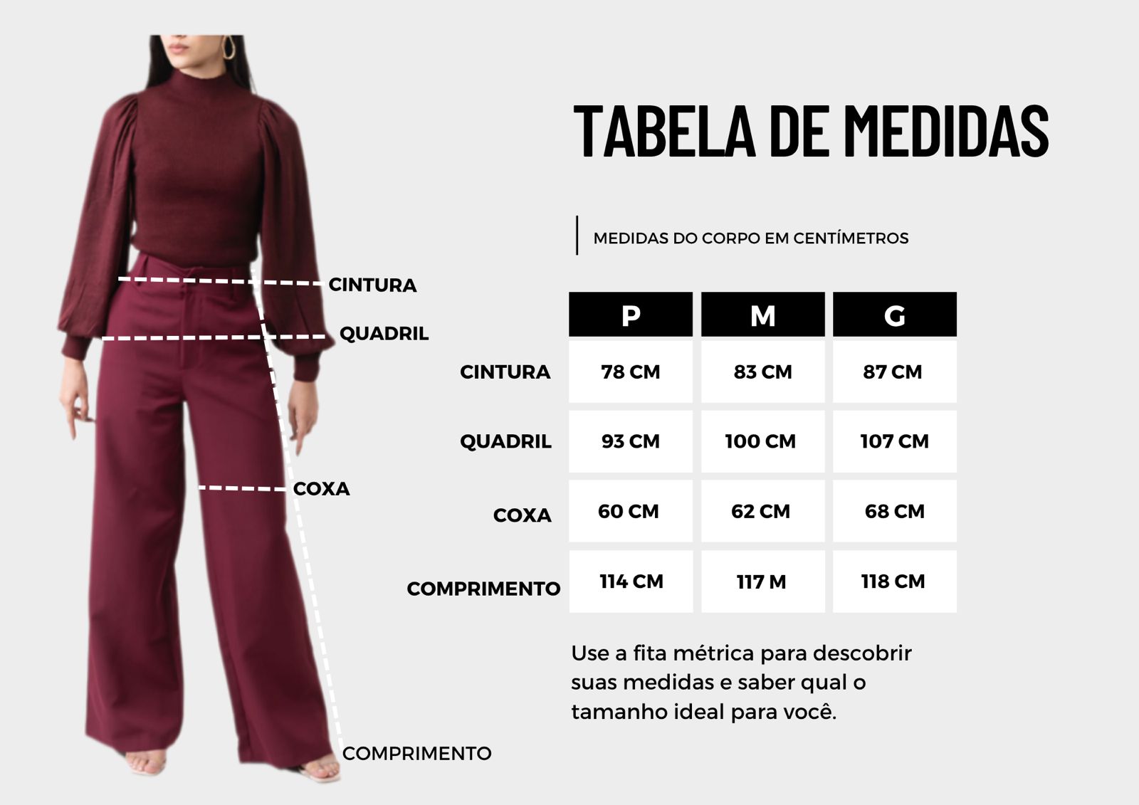 As medidas de cintura, quadril e coxa indicam a circunferência total, ou seja, como se a fita métrica desse uma volta completa ao redor do seu corpo (frente + verso). A modelo usa P (36)