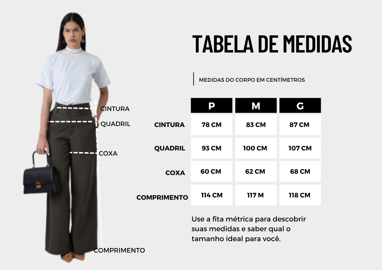 As medidas de cintura, quadril e coxa indicam a circunferência total, ou seja, como se a fita métrica desse uma volta completa ao redor do seu corpo (frente + verso). A modelo usa P (36)