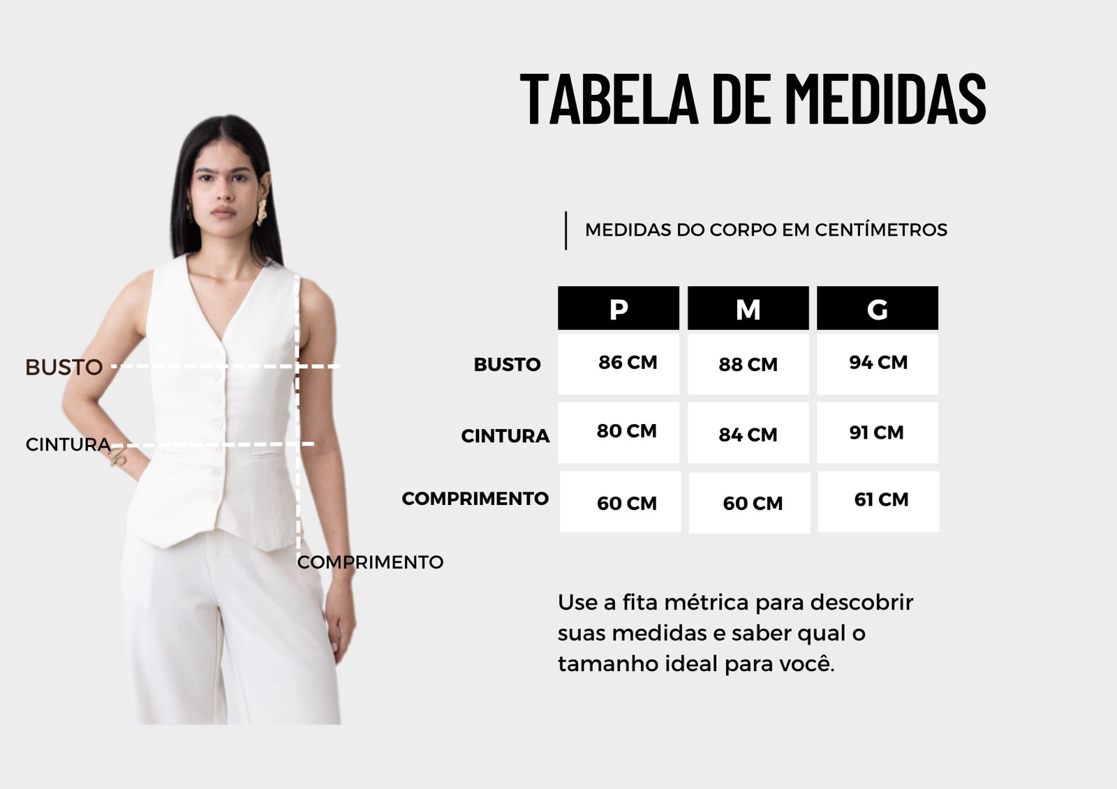 As medidas do busto e cintura indicam a circunferência total, ou seja, como se a fita métrica desse uma volta completa ao redor do seu corpo (frente + verso). A modelo usa P (36)